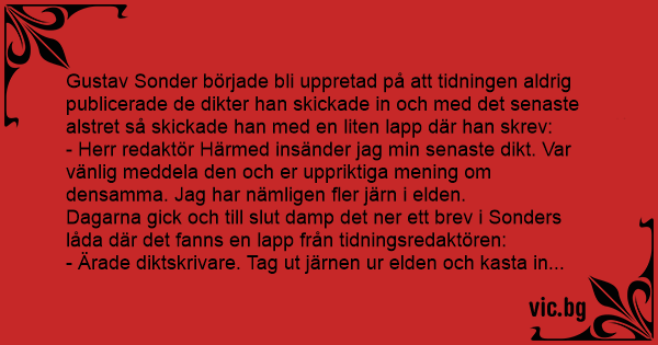 Gustav Sonder började bli uppretad på att tidningen aldrig publicerade de dikter han skickade in och med det senaste alstret så skickade han med en liten lapp där han skrev: