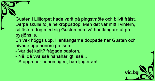Gusten i Lilltorpet hade varit på pingstmöte och blivit frälst. Därpå skulle följa helkroppsdop. Men det var mitt i vintern, så ästorn tog med sig Gusten och två hantlangare ut på bysjöns is.