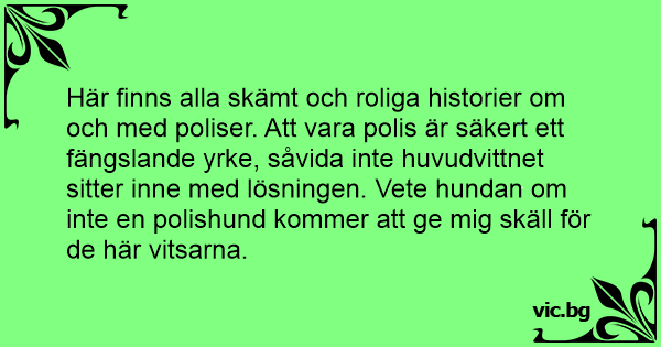 Här finns alla skämt och roliga historier om och med poliser. Att vara polis är säkert ett fängslande yrke, såvida inte huvudvittnet sitter inne med lösningen. Vete hundan om inte en polishund kommer att ge mig skäll för de här vitsarna.