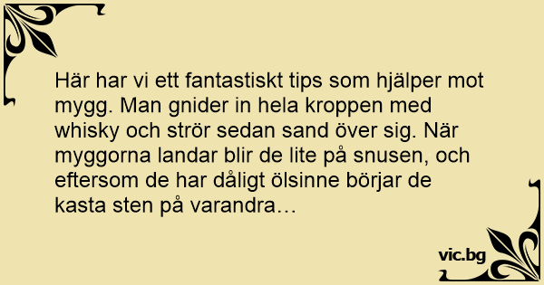 Här har vi ett fantastiskt tips som hjälper mot mygg. Man gnider in hela kroppen med whisky och strör sedan sand över sig. När myggorna landar blir de lite på snusen, och eftersom de har dåligt ölsinne börjar de kasta sten på varandra…