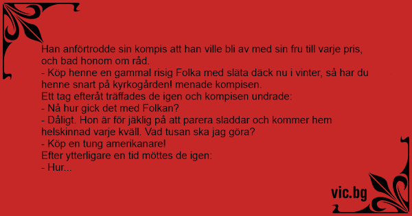 - Köp henne en gammal risig Folka med släta däck nu i vinter, så har du henne snart på kyrkogården! menade kompisen.