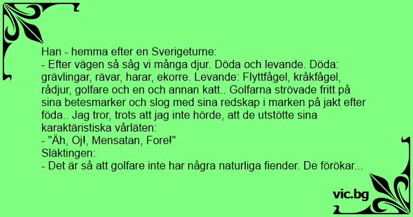- Efter vägen så såg vi många djur. Döda och levande. Döda: grävlingar, rävar, harar, ekorre. Levande: Flyttfågel, kråkfågel, rådjur, golfare och en och annan katt.. Golfarna strövade fritt på sina betesmarker och slog med sina redskap i marken på jakt efter föda.. Jag tror, trots att jag inte hörde, att de utstötte sina karaktäristiska vårläten: