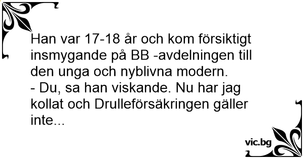- Du, sa han viskande. Nu har jag kollat och Drulleförsäkringen gäller inte...