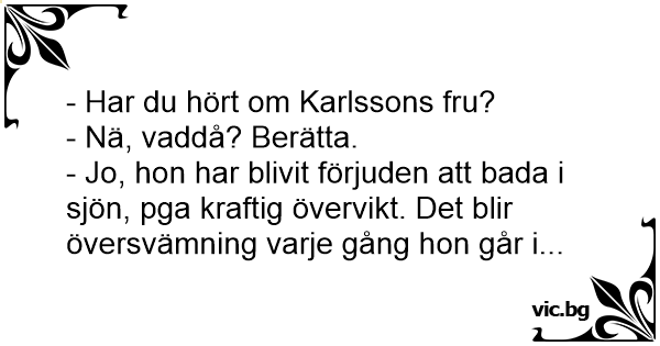 - Har du hört om Karlssons fru? - Nä, vaddå? Berätta. - Jo, hon har blivit förjuden att bada i sjön, pga kraftig övervikt. Det blir översvämning varje gång hon går i...