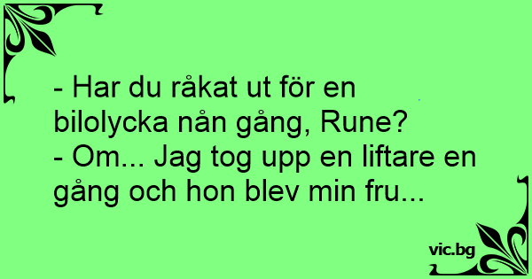 - Имал ли си някога автомобилна катастрофа, Киро? - Ами... да. Веднъж взех стопаджийка и после се ожених за нея...