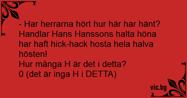 - Har herrarna hört hur här har hänt? Handlar Hans Hanssons halta höna har haft hick-hack hosta hela halva hösten!