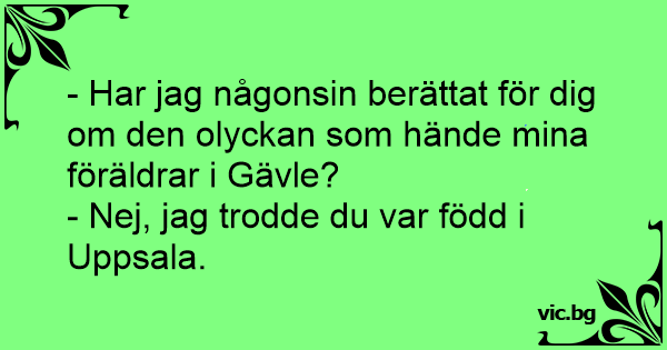- Har jag någonsin berättat för dig om den olyckan som hände mina föräldrar i Gävle? - Nej, jag trodde du var född i Uppsala.