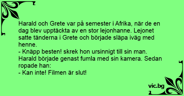 Harald och Grete var på semester i Afrika, när de en dag blev upptäckta av en stor lejonhanne. Lejonet satte tänderna i Grete och började släpa iväg med henne.