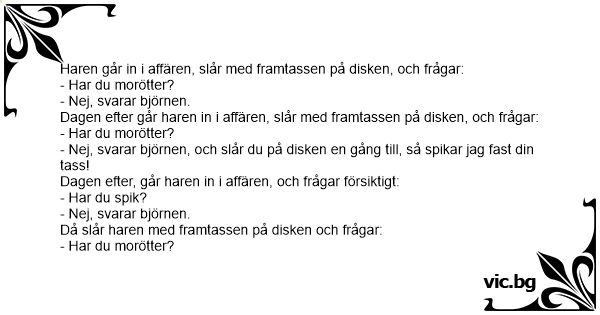 Haren går in i affären, slår med framtassen på disken, och frågar:
