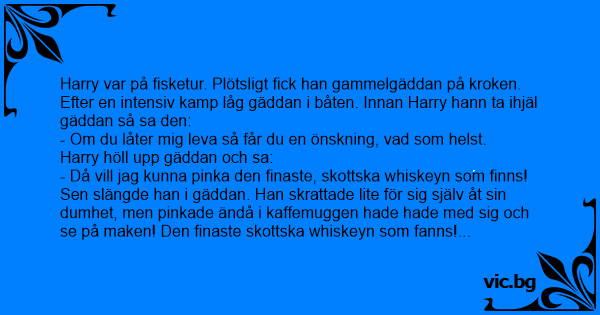 Sen slängde han i gäddan. Han skrattade lite för sig själv åt sin dumhet, men pinkade ändå i kaffemuggen hade hade med sig och se på maken! Den finaste skottska whiskeyn som fanns! Glad i hågen sprang han hem och berättade för frun, pinkade i två glas och gav frun det ena glaset. Dan efter kom han hem från jobbet, pinkade i två glas och gav frun det ena. Så blev det fredag, Harry kom hem från jobbet, pinkade i ett glas och satte sig i soffan. Då kom frun in: