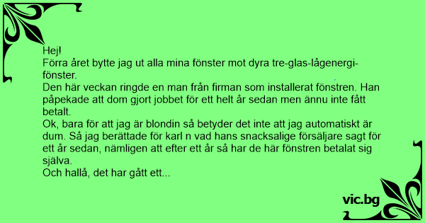 Ok, bara för att jag är blondin så betyder det inte att jag automatiskt är dum. Så jag berättade för karl n vad hans snacksalige försäljare sagt för ett år sedan, nämligen att efter ett år så har de här fönstren betalat sig själva.