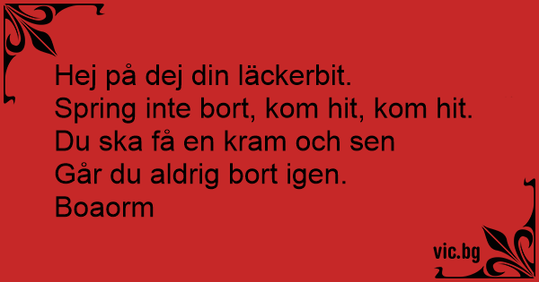 Hej på dej din läckerbit. Spring inte bort, kom hit, kom hit. Du ska få en kram och sen Går du aldrig bort igen. Boaorm