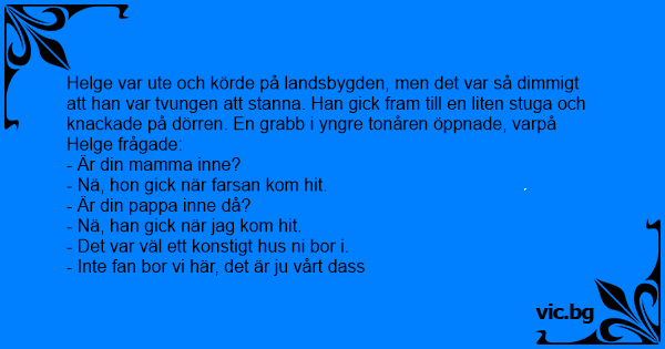 Helge var ute och körde på landsbygden, men det var så dimmigt att han var tvungen att stanna. Han gick fram till en liten stuga och knackade på dörren. En grabb i yngre tonåren öppnade, varpå Helge frågade: