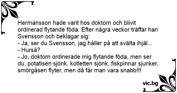 Hermansson hade varit hos doktorn och blivit ordinerad flytande föda. Efter några veckor träffar han Svensson och beklagar sig: