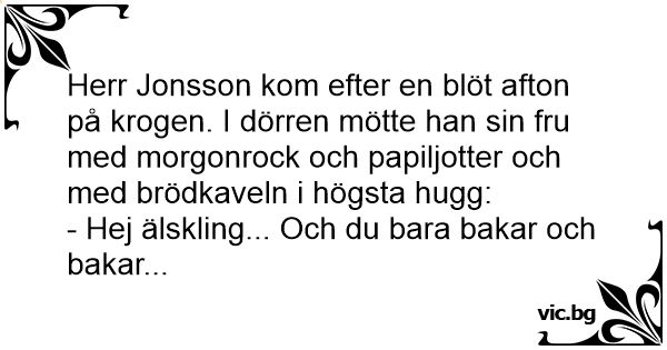 Herr Jonsson kom efter en blöt afton på krogen. I dörren mötte han sin fru med morgonrock och papiljotter och med brödkaveln i högsta hugg: