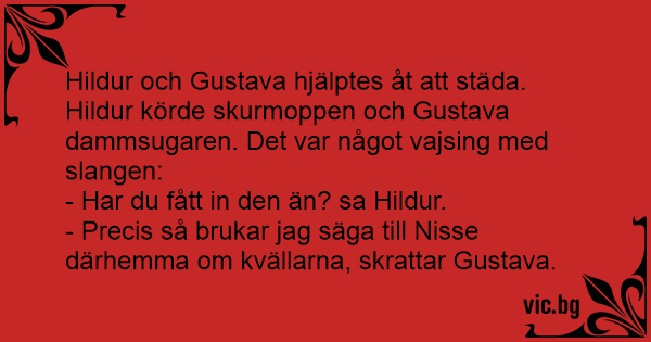 Hildur och Gustava hjälptes åt att städa. Hildur körde skurmoppen och Gustava dammsugaren. Det var något vajsing med slangen: