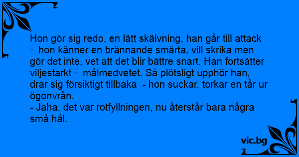 Hon gör sig redo, en lätt skälvning, han går till attack hon känner en brännande smärta, vill skrika men gör det inte, vet att det blir bättre snart. Han fortsätter viljestarkt målmedvetet. Så plötsligt upphör han, drar sig försiktigt tillbaka - hon suckar, torkar en tår ur ögonvrån.