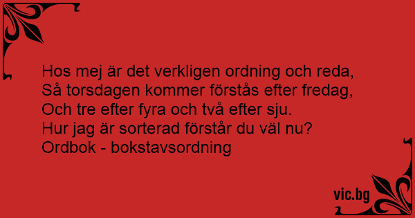 Hos mej är det verkligen ordning och reda, Så torsdagen kommer förstås efter fredag, Och tre efter fyra och två efter sju. Hur jag är sorterad förstår du väl nu? Ordbok - bokstavsordning