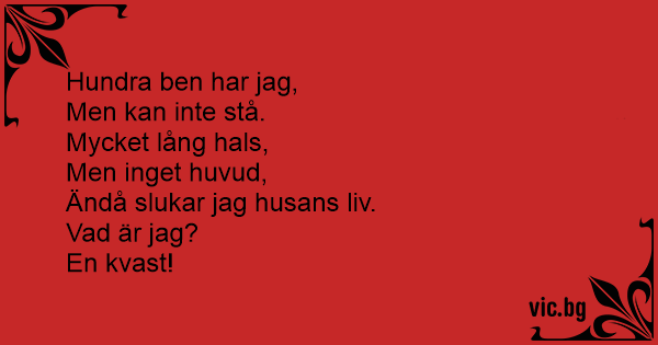Hundra ben har jag, Men kan inte stå. Mycket lång hals, Men inget huvud, Ändå slukar jag husans liv. Vad är jag? En kvast!