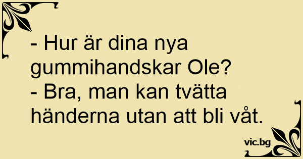 - Hur är dina nya gummihandskar Ole?<br />- Вrа, man kan tvätta händerna utan att bli våt.