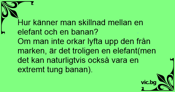 Om man inte orkar lyfta upp den från marken, är det troligen en elefant(men det kan naturligtvis också vara en extremt tung banan).