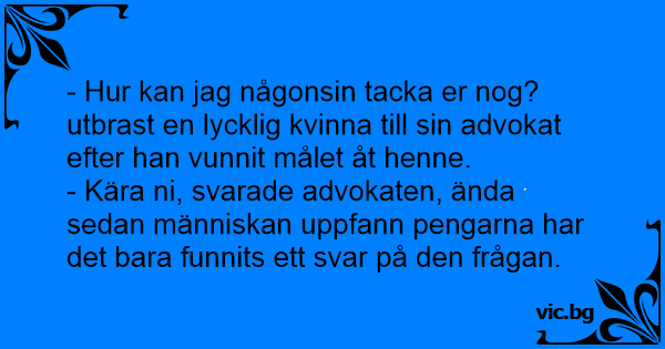 - Hur kan jag någonsin tacka er nog? utbrast en lycklig kvinna till sin advokat efter han vunnit målet åt henne.
