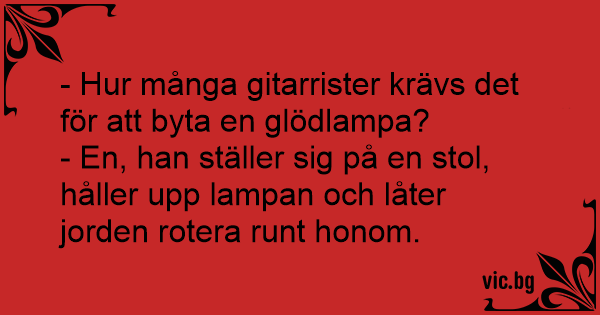 - Hur många gitarrister krävs det för att byta en glödlampa?<br />- En, han ställer sig på en stol, håller upp lampan och låter jorden rotera runt honom.