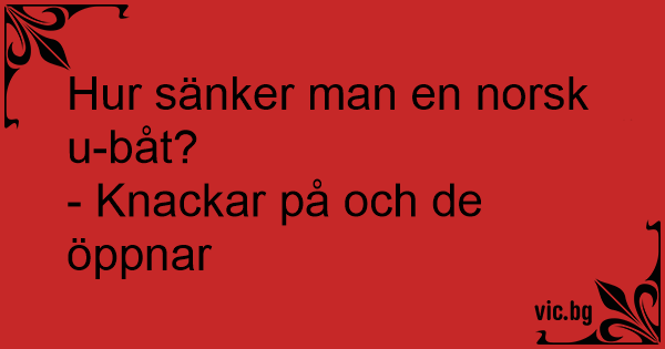 - Vet du hur man sänker en norsk U-båt ? - Nej! - Man simmar ner dit å knackar på, å öppnar dom dörren å sjunker...! Vet du hur man sänker den igen ? - Nej! - Man simmar nej dit å knackar på,...