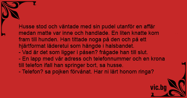 Husse stod och väntade med sin pudel utanför en affär medan matte var inne och handlade. En liten knatte kom fram till hunden. Han tittade noga på den och på ett hjärtformat läderetui som hängde i halsbandet.