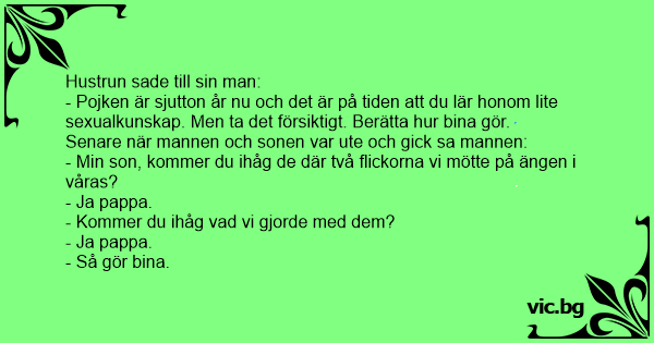 - Pojken är sjutton år nu och det är på tiden att du lär honom lite sexualkunskap. Men ta det försiktigt. Berätta hur bina gör.