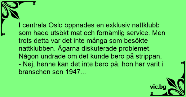 I centrala Oslo öppnades en exklusiv nattklubb som hade utsökt mat och förnämlig service. Men trots detta var det inte många som besökte nattklubben. Ägarna diskuterade problemet. Någon undrade om det kunde bero på strippan.