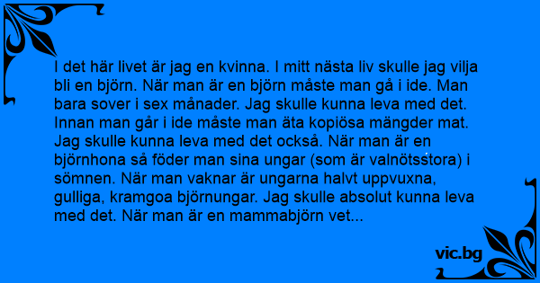 I det här livet är jag en kvinna. I mitt nästa liv skulle jag vilja bli en björn. När man är en björn måste man gå i ide. Man bara sover i sеx månader. Jag skulle kunna leva med det. Innan man går i ide måste man äta kopiösa mängder mat. Jag skulle kunna leva med det också. När man är en björnhona så föder man sina ungar (som är valnötsstora) i sömnen. När man vaknar är ungarna halvt uppvuxna, gulliga, kramgoa björnungar. Jag skulle absolut kunna leva med det. När man är en mammabjörn vet alla att man menar allvar – man klappar till vem som helst som stör ens ungar. När ungarna blir irriterande klappar man till dem med. Jag skulle definitivt kunna leva med det. Om man är en björn så FÖRUTSÄTTER ens partner att man vaknar med en morrning. Han FÖRUTSÄTTER att man har håriga ben och ett överflöd av underhudsfett. Japp, jag skall bli en björn….