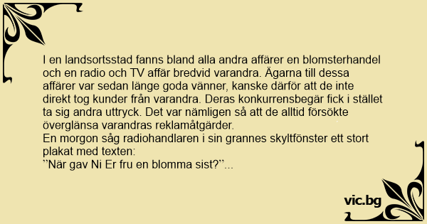 I en landsortsstad fanns bland alla andra affärer en blomsterhandel och en radio och TV affär bredvid varandra. Ägarna till dessa affärer var sedan länge goda vänner, kanske därför att de inte direkt tog kunder från varandra. Deras konkurrensbegär fiск i stället ta sig andra uttryck. Det var nämligen så att de alltid försökte överglänsa varandras reklamåtgärder.