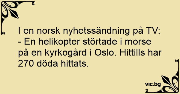 Kirkegården En blondine siger til en anden “Vidste du godt der var en helikopter der styrtede ned i kirkegården i går? Der er fundet mange døde og tallet er stigende”.