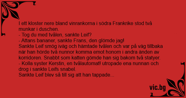 - Kolla syster Kerstin, en tvålautomat! utropade ena nunnan och drog i sankte Leifs snabel.