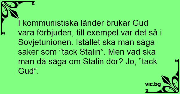 I kommunistiska länder brukar Gud vara förbjuden, till exempel var det så i Sovjetunionen. Istället ska man säga saker som ”tack Stalin”. Men vad ska man då säga om Stalin dör? Jo, ”tack Gud”.