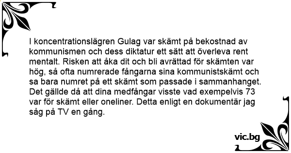 I koncentrationslägren Gulag var skämt på bekostnad av kommunismen och dess diktatur ett sätt att överleva rent mentalt. Risken att åka dit och bli avrättad för skämten var hög, så ofta numrerade fångarna sina kommunistskämt och sa bara numret på ett skämt som passade i sammanhanget. Det gällde då att dina medfångar visste vad exempelvis 73 var för skämt eller oneliner. Detta enligt en dokumentär jag såg på TV en gång.