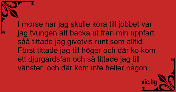 I morse när jag skulle köra till jobbet var jag tvungen att backa ut från min uppfart såå tittade jag givetvis runt som alltid. Först tittade jag till höger och där ko kom ett djurgårdsfan och så tittade jag till vänster  och där kom inte heller någon.