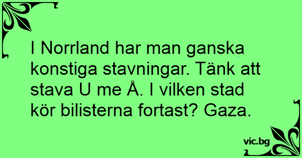 I Norrland har man ganska konstiga stavningar. Tänk att stava U me Å. I vilken stad kör bilisterna fortast? Gaza.
