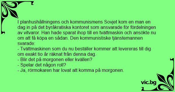 I planhushållningens och kommunismens Sovjet kom en man en dag in på det byråkratiska kontoret som ansvarade för fördelningen av vitvaror. Han hade sparat ihop till en tvättmaskin och ansökte nu om att få köpa en sådan. Den kommunistiske tjänstemannen svarade: