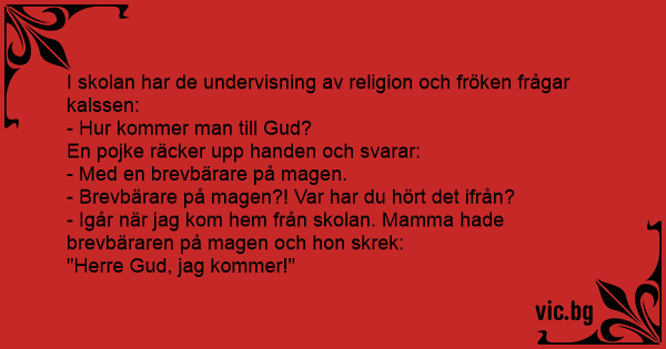 I skolan har de undervisning av religion och fröken frågar kalssen: - Hur kommer man till Gud? En pojke räcker upp handen och svarar: - Med en brevbärare på magen. - Brevbärare på magen?! Var har du hört det ifrån? - Igår när jag kom hem från skolan. Mamma hade brevbäraren på magen och hon skrek: "Herre Gud, jag kommer!"