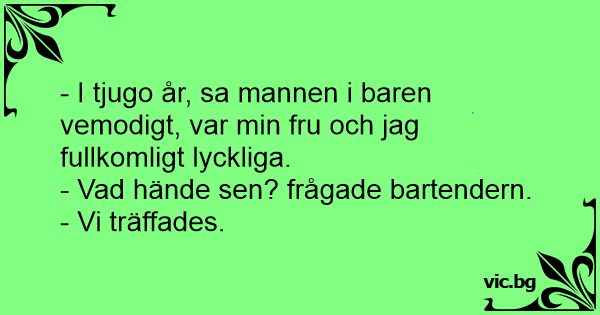 Man in kroeg: "Achttien jaar zijn mijn vrouw en ik gelukkig geweest." Buurman: "En wat gebeurde er toen?" Man: "Toen hebben we elkaar ontmoet."