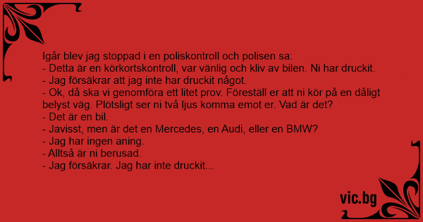 - Detta är en körkortskontroll, var vänlig och kliv av bilen. Ni har druckit.