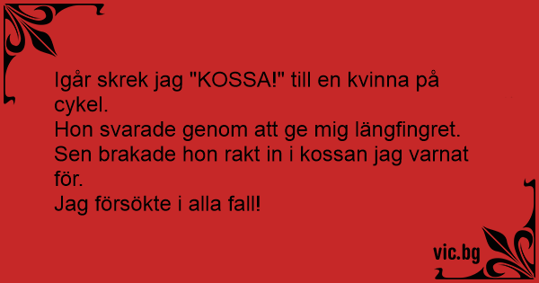 Jeg skrek "KU!" til en kvinne på sykkelen. Нun svarte med å vise meg fingeren. Like etter det kjørte hun rett i kua. Jeg forsøkte...