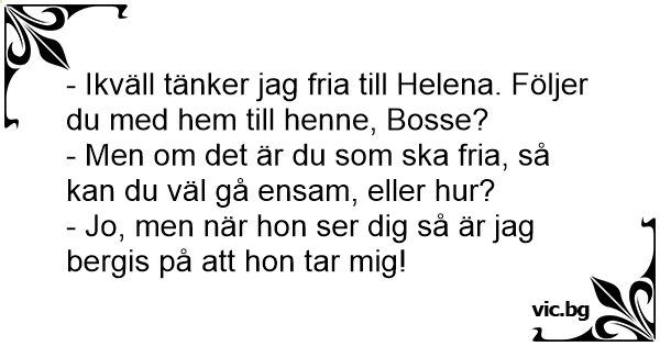 - Ikväll tänker jag fria till Helena. Följer du med hem till henne, Bosse?