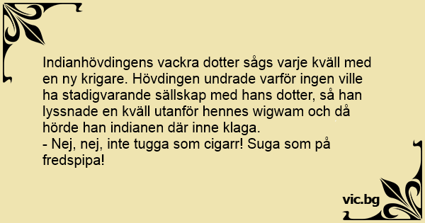 Indianhövdingens vackra dotter sågs varje kväll med en ny krigare. Hövdingen undrade varför ingen ville ha stadigvarande sällskap med hans dotter, så han lyssnade en kväll utanför hennes wigwam och då hörde han indianen där inne klaga.