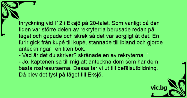 Inryckning vid I12 i Eksjö på 20-talet. Som vanligt på den tiden var större delen av rekryterria berusade redan på tåget och gapade och skrek så det var sorgligt åt det. En furir gick från kupé till kupé, stannade till ibland och gjorde anteckningar i en liten bok.