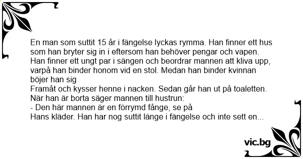 Et ægtepar bliver overrumplet at en indbrudstyv. Han binder dem til sengen og bøjer sig ned og kysser kvinden på kinden. Derefter går han ud på badeværelset. Manden siger til konen: Jeg så godt han...