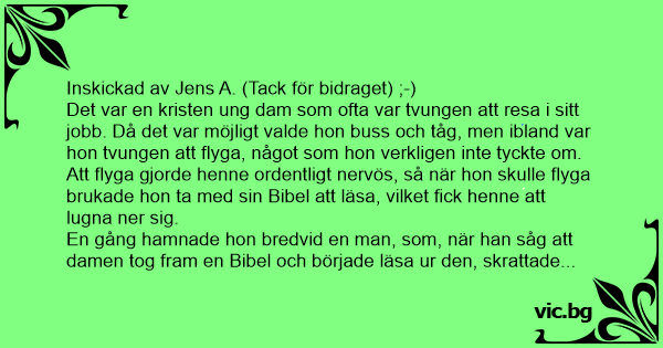 Det var en kristen ung dam som ofta var tvungen att resa i sitt jobb. Då det var möjligt valde hon buss och tåg, men ibland var hon tvungen att flyga, något som hon verkligen inte tyckte om. Att flyga gjorde henne ordentligt nervös, så när hon skulle flyga brukade hon ta med sin Bibel att läsa, vilket fiск henne att lugna ner sig.