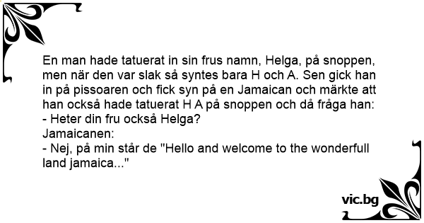 Det var ett europeiskt par som skulle åka på smekmånad till Bahamas. Mannen ville göra tjejen lite glad så han tatuerade han in hennes namn, Wendy, på manslemmen. Dessvärre syntes bara W och Y när...